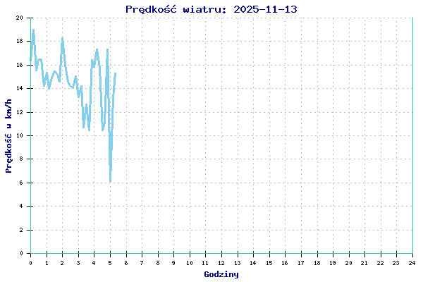 Dzisiaj - Minimalna: 13.24 km/h, Maksymalna: 19.03 km/h, Średnia: 15.37 km/h