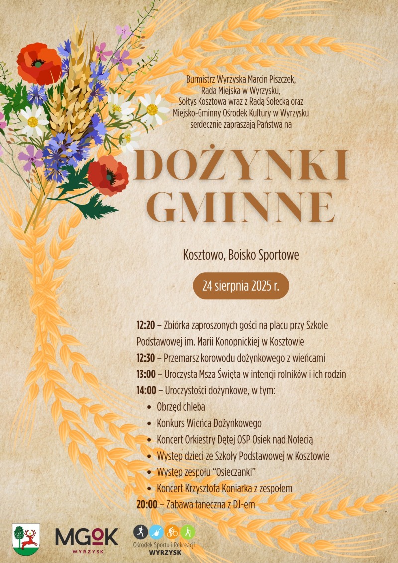 Burmistrz Wyrzyska Marcin Piszczek, Rada Miejska w Wyrzysku, Sołtys Kosztowa wraz z Radą Sołecką oraz Miejsko-Gminny Ośrodek Kultury w Wyrzysku serdecznie zapraszają na Dożynki Gminne, które odbędą się 24 sierpnia 2025 roku w Kosztowie.