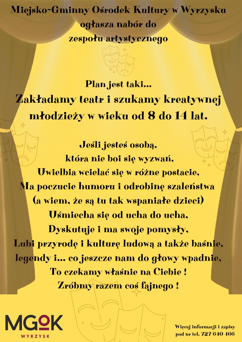 Wyrzysk, dodano: 2026-03-16, godz.21:18Miejsko-Gminny Ośrodek Kultury w Wyrzysku zaprasza utalentowaną młodzież do zespołu artystycznego.