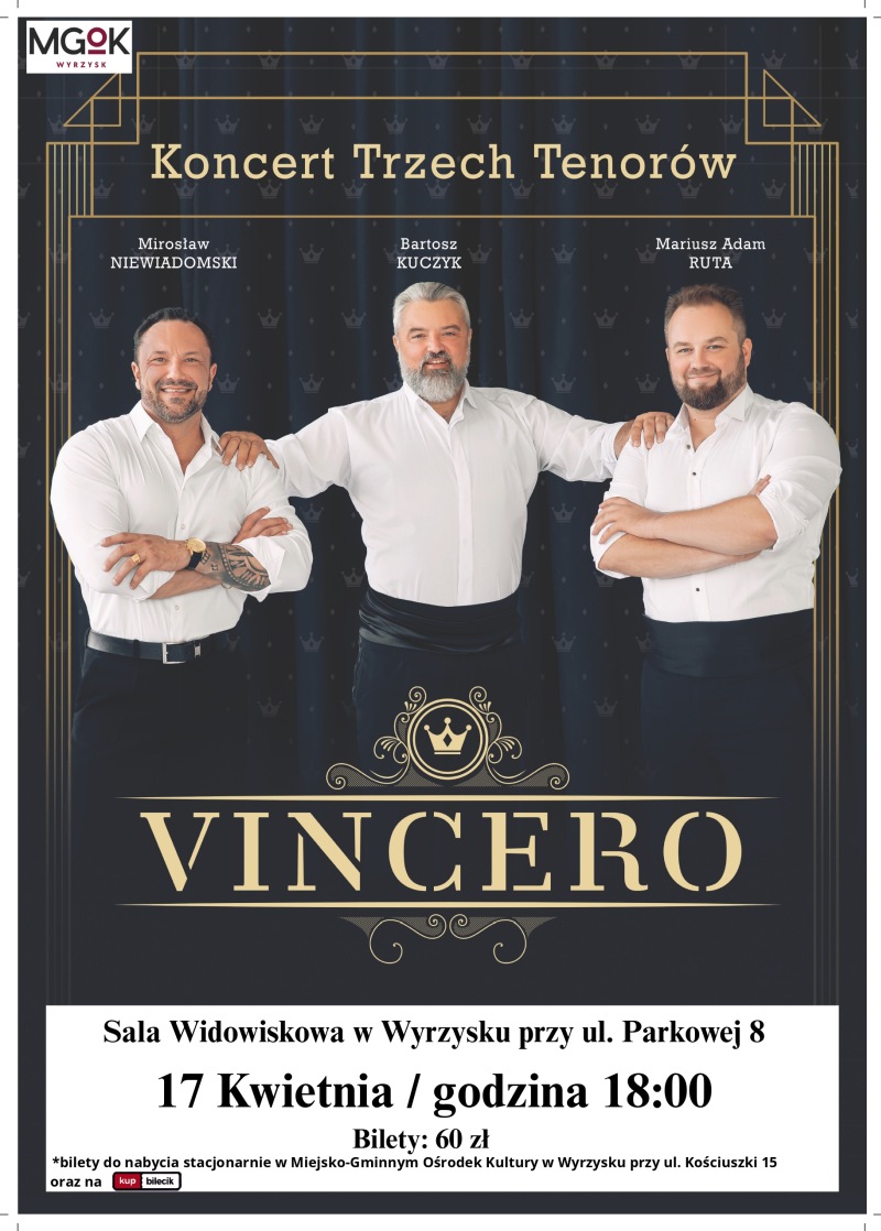 Wyrzysk, dodano: 2026-03-16, godz.21:25Jeśli stronisz od poważnych koncertów, wymajających skupienia i zastanawiania się nad odwiecznym pytaniem "co artysta miał na myśli..." to dobrze trafiłeś. Formacja "Vincero" czyli trzech tenorów to właśnie odpowiedź na takie wydarzenia.