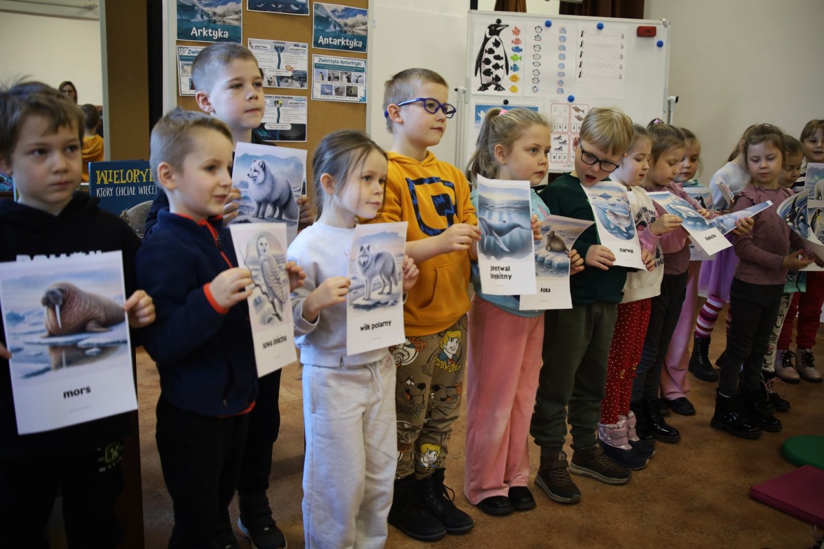 Wyrzysk, dodano: 2026-01-29, godz.19:50Zima to czas, który fascynuje dzieci swoją unikalną atmosferą i charakterystycznymi zmianami w przyrodzie. Przeprowadzenie zajęć opartych na tematyce zimowej stworzyło idealną okazję do rozwijania wyobraźni i kreatywności najmłodszych, a także do nauki o środowisku naturalnym i jego mieszkańcach w okresie zimy. O obszarach na Ziemi z najzimniejszym klimatem, czyli o Arktyce i Antarktydzie rozmawialiśmy z przedszkolakami z Wyrzyska, którym zima nie jest straszna, a którzy mimo szczypiącego mrozu w uszy postanowili odwiedzić nas w Bibliotece Publicznej w Wyrzysku. Nasi mali goście z ogromnym zainteresowaniem wysłuchali opowiadania Alex Willmore „Naprawdę widziałem Mamuta” – przezabawnej historii, gdzie ekipa nieustraszonych polarników bada życie pingwinów. Po wysłuchaniu opowieści nadszedł czas na rozmowę o biegunach. Dzieci poznały różnice między Arktyką a Antarktydą, a dzięki kolorowym ilustracjom poznały także zwierzęta żyjące w tych rejonach. Przedszkolaki chętnie wymieniały znane im gatunki a najwięcej emocji zdecydowanie wzbudziły pingwiny i niedźwiedzie polarne. Kolejnym punktem spotkania były zabawy ruchowe podczas których maluchy tańczyły, naśladując pingwiny chodzące po lodzie. Wspólna zabawa, bez wątpienia wywołała wiele uśmiechów i radości. Spotkanie w bibliotece było ciekawe i pełne zimowych przygód.